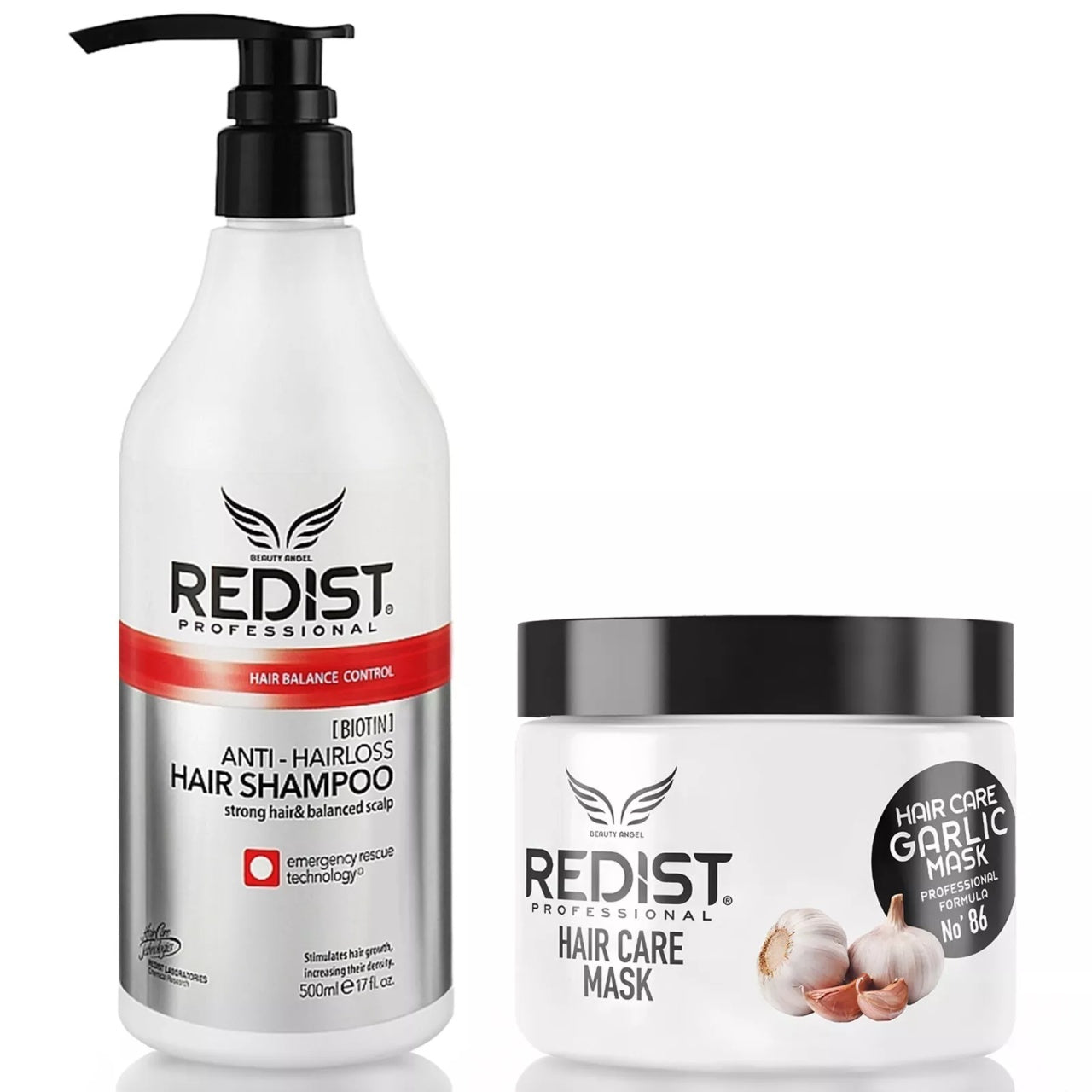 Șampon Anti Hair Loss Redist 500 ml Șonul Anti Hair Loss Redist ajută la prevenirea căderii părului și restabilește hidratarea optimă a scalpului, combinației de aminoacizi, multivitamine și extract din plante. Special formulat pentru a revitaliza și întări părul, acest șampon combate căderea excesivă și contribuie la sănătatea generală a părului. Mod de utilizare: Aplicați pe părul umed, masați delicat scalpul și lăsați să acționeze timp de 1-2 minute. Clătiți bine și repetați, dacă este necesar. Masca cu Extract de Usturoi Redist 475 ml Această masca profesională este creată pentru a fortifica foliculii de păr și a reduce căderea acestuia, oferind un păr mai puternic și strălucitor. Formula sa unică, îmbogățită cu extract de usturoi, stimulează creșterea părului și ajută la stoparea căderii firelor de păr. În ciuda ingredientului principal, formula sa fără miros de usturoi tratează părul în profunzime și îl învăluie cu o aromă plăcută. Pentru rezultate optime, folosiți masca în combinație cu șamponul cu extract de usturoi din aceeași gamă, pentru o regenerare și creștere eficientă a părului. Mod de utilizare: După ce șampoanați părul cu șamponul cu extract de usturoi, tamponați părul cu un prosop, apoi aplicați masca pe întreaga lungime a părului. Lăsați să acționeze 3-5 minute, apoi clătiți cu apă din abundență.