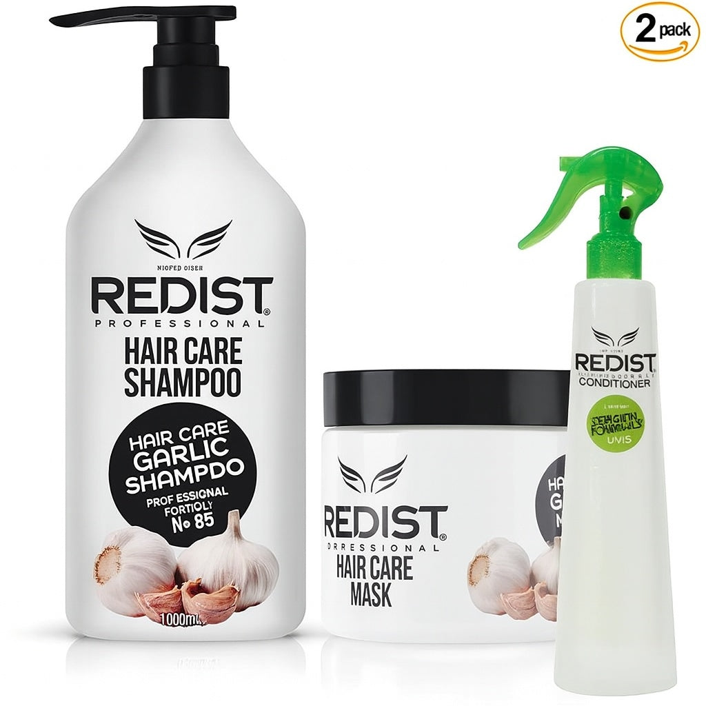 Pachet Promo Redist Garlic & Miracle Oils – Regenerare și Protecție Completă Pachet profesional pentru îngrijirea completă a părului, ideal împotriva căderii și pentru stimularea creșterii: Șampon Redist cu usturoi 1000 ml – Fortifică firul de păr și reduce căderea. Fără miros de usturoi. Mască Redist cu usturoi 475 ml – Hidratează, regenerează și oferă strălucire. Balsam bifazic pentru par cu Keratina Redist 400ml . Protejează termic, hidratează și lasă părul moale și ușor de coafat. Fără clătire. ✔ Păr mai puternic, mai sănătos și strălucitor ✔ Regenerare + protecție termică + hidratare Mod de utilizare recomandat pentru rezultate optime: Spălă părul cu șamponul cu usturoi și clătește bine. Aplică masca cu usturoi pe părul umed, las-o să acționeze 3-5 minute, apoi clătește abundent. Pe părul umed, pulverizează balsamul bifazic cu keratina , fără a clăti.