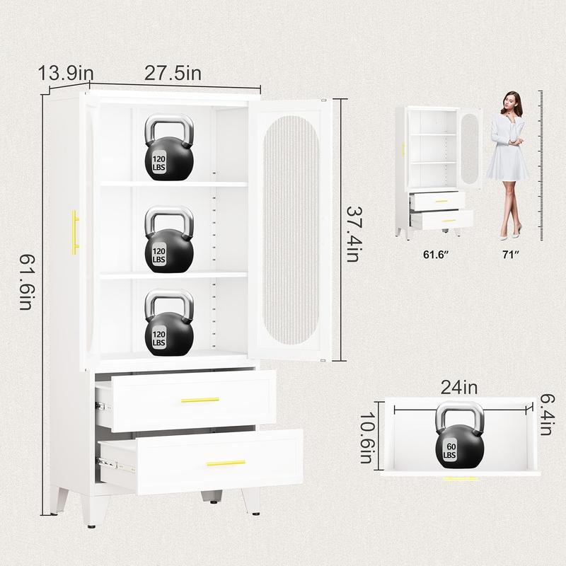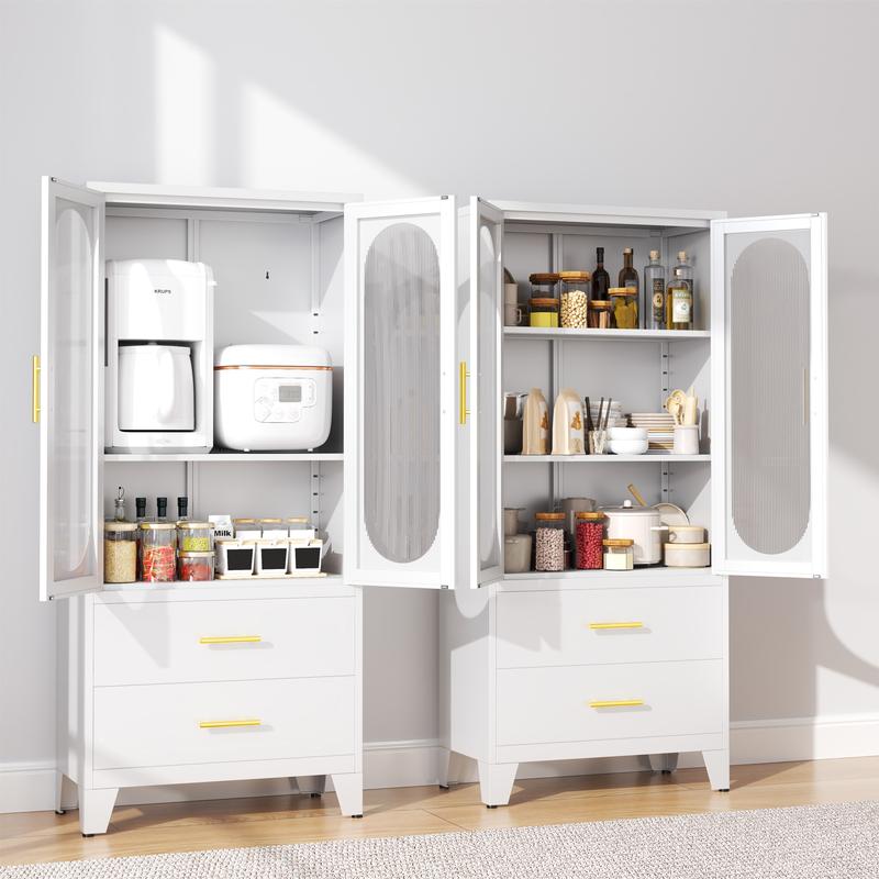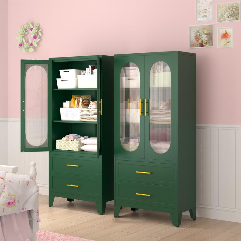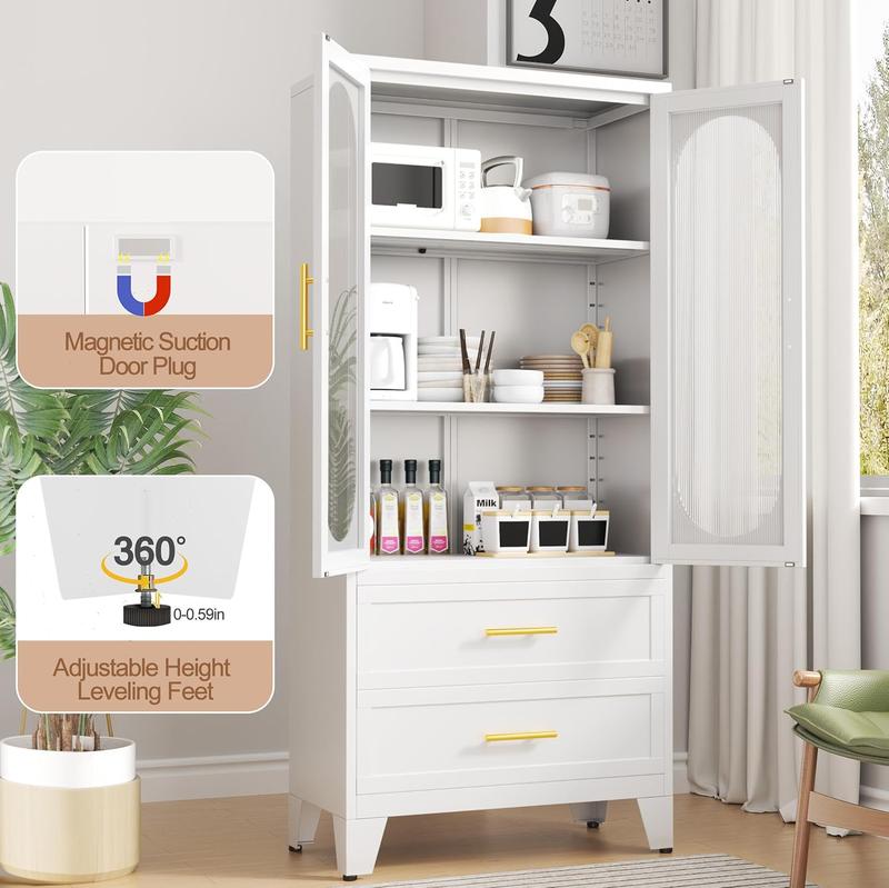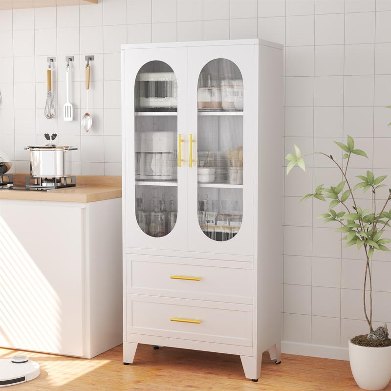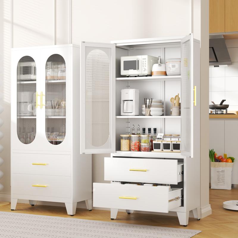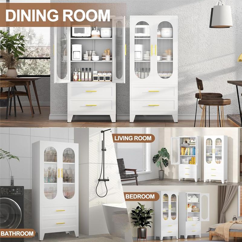 Dulap metalic de depozitare cu 2 uși din sticlă acrilică și 2 rafturi reglabile, dulap de bucătărie cu 2 sertare, dulap de depozitare din oțel cu înălțimea de 61,6" pentru dormitor, bucătărie, organizator de mobilier de baie